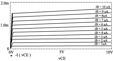 Typically, aF is very close to unity (e.g. aF = 0.99), and bF is on the order of 102. BJT circuits are readily simulated using PSpice. The file Eval.lib that comes with the student version of PSpice contains models for popular BJTs, including the 2N2222A npn and the 2N3906 pnp BJT. For instance, to invoke a 2N2222A BJT from the built in library, we use a command of the type QXXX C B E Q2N2222A where QXXX is the name of the specific BJT, such as Q1, and C, B, and E are the collector, base, and emitter nodes, in that specific order. Shown below is the PSpice code for the curve tracer circuit of Fig. 1, which is used to display the iC -vCE characteristics of a 2N2222A BJT called Q1: BJT Characteristics The characteristics are shown in Fig. 2.