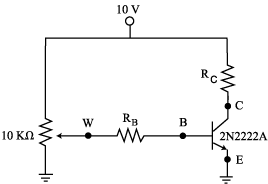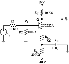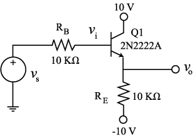 M1: Mark one of your 2N2222A BJTs, and use the curve tracer to measure bF and ro at the operating point Q(IC , VCE ) = Q(1 mA, 5 V). Recall that bF = IC /IB, where IB is the base current required to sustain the desired IC , and that 1/ro is the slope of the iC -vCE curve at Q. Then, estimate the Early voltage VA from 1/ro = IC/(VA + VCE). Dont forget to express your data in the form X±DX. Note: If the curve tracer is already in use by another group, proceed with the next steps and return to the present one later. M2: With power off, assemble the circuit of Fig. 4 with RC = 5.0 kW (use 2 x 10-kW resistors in parallel) and RB = 500 kW (use 2 x 1.0-MW resistors in parallel); keep the leads short, and bypass the power supply bus with a 0.1-mF capacitor, as recommended in Appendix A2. Then, apply power and adjust the potentiometer until VCE @ 5 V; record also the voltages VW and VBE (when measuring VBE, use as many digits as your DVM will allow). M3: Turn power off, configure your DMM as a DC ammeter, break the circuit at node C, and insert the ammeter in series; then, reapply power and measure IC both with RC in place, as shown, and with RC shorted out with a wire. The difference DIC between the two readings will be small, so make sure you use as many digits as your ammeter will allow. Note that shorting out RC is designed to cause a change DVCE = 5 V. C4: Use the data of Steps M2 and M3 to compute bF, VA, and IS at the operating point Q(1 mA, 5 V) as follows: (a) bF = IC /IB, where IB is found as IB = (VW - VBE)/RB. You may want to measure also RB for more accurate results (dont forget to pull RB out of the circuit when measuring it!) (b) VA = roIC - VCE, where ro = DVCE /DIC (c) Dont forget to express your data in the form X±DX. Then, compare the values of bF and VA with those of Step M1, and comment. Which set of values do you think is more dependable? Saturation Characteristics: To observe these characteristics we use again the circuit of Fig. 4, but with RC = 10 kW and RB = 100 kW. As you make these changes, dont forget to turn power off! M5: Starting with the wiper voltage vW at zero, gradually rise vW while monitoring vCE with the DVM. As vW rises, vCE decreases until it saturates at vCE = VCE(sat). Record the values of vW , vBE, and vCE at the point when vCE just begins to saturate, a situation aptly referred to as the edge-of-saturation. Use the above data to calculate the ratio IC/IB at the edge of saturation; how does this ratio compare with the value of bF found earlier? M6: Now rise the wiper all the way up to 10 V, while still monitoring vCE with the DVM. Does vCE change appreciably as the operating point is moved from edge-of-saturation to deep saturation? What is the value of the ratio IC/IB when vW = 10 V? How does it compare with bF ? Justify the designation bforced for the ratio IC/IB when operation is past the edge-of-saturation. Common-Emitter Amplifier: With power off, assemble the circuit of Fig. 5 (implement RE with 2 x 10-kW resistors in series), keeping the leads short and bypassing the power supply busses with 0.1-mF capacitors, as recommended in Appendix A2. Since the input vi must be a small signal in order for the BJT to operate approximately linearly, we interpose a voltage divider R1 and R2 between the input source and the BJT to suitably scale down the source. With the resistor values shown we have vi @ vs/100. C7: Assuming vs has DC value of 0 V in Fig. 5, predict the DC voltages VB, VE, and VC at the base, emitter, and collector terminals, as well as the small signal gain Av = vo/vi. M8: While monitoring vs with Ch.1 of the oscilloscope (DC mode, Trigger from Ch. 1), adjust the signal generator so that vs in Fig. 5 is a 10-kHz sinewave with 0-V DC and 1-V peak amplitude (this makes vi a 10-mV peak amplitude sinewave). Next, use CH. 2 (DC mode, Chop Mode), to measure the DC voltages at the base, collector, and emitter pins; finally, switch Ch. 2 to the AC mode and measure the peak amplitude of vo; hence, find the gain Av = vo/viof your amplifier.