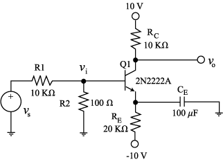 The following PSpice code is used to simulate the basic CE amplifier of Fig. 3: CE Amplifier After running PSpice, we obtain an output file with the following information: BIAS SOLUTION: NODE VOLTAGE NODE VOLTAGE NODE VOLTAGE NODE VOLTAGE NODE VOLTAGE NODE VOLTAGE AC ANALYSIS: FREQ VM(1) VP(1) VM(6)