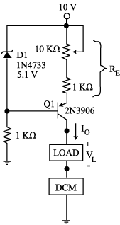 MC15: Mark one of your 2N3906 BJTs, and use the curve tracer to estimate its Early voltage VA. Note: The estimation of VA is similar to that of Step M1, except that you now need to adjust the POSITION knobs so that the origin of the i-v characteristic is at the upper right corner of the CRT; moreover, you must switch the POLARITY knobs from + to - both in the BASE STEP GENERATOR and the COLLECTOR SWEEP controls. Once you have VA, estimate the output resistance Ro of the current source of Fig. 8 as seen by the load; do your estimation for for the case IO = 1.0 mA M16: With power off, assemble the circuit of Fig. 8, keeping leads short and using a 0.1-mF power supply bypass capacitor, as usual. Then, with the multimeter configured as a digital current meter (DCM) and using first a wire as a load, turn on power and adjust the pot for IO = 1.0 mA. Next, turn power off, insert a 3.0-kW load, and turn again power on: does IO change appreciably in spite of the 3-V change in the load voltage VL? Justify in terms of the output resistance Ro estimated in Step. MC15. MC17: Now rise the supply voltage from 10 V to 15 V while monitoring IO with the DCM. By how much does IO change? Justify quantitatively in terms of the zener diode model!