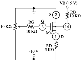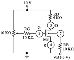 M2: For the nMOSFET of Fig. 7 adjust the potentiometer until VDS = 5 V (for RD use 2 x 10-kW resistors in parallel). Also, record the value of VGS, which will be needed in Step M6. Next, turn off power, configure your DMM as a DC ammeter, break the circuit at node D, insert the ammeter in series, reapply power and measure ID both with RD in place as shown, and with RD shorted out with a wire. The difference DID between the two readings will be small, so make sure to use as many digits as your ammeter will allow. Note that shorting out RD is designed to cause a change DVDS = 5 V. As usual, all your data should be expressed in the form X±DX.