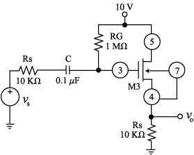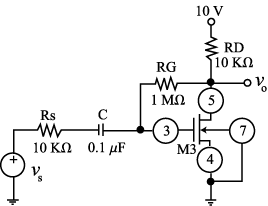 M10: While monitoring vs with Ch.1 of the oscilloscope (DC mode, Trigger on Ch. 1), adjust the signal generator so that vs in Fig. 11 is a 10-kHz sinewave with 0-V DC and 0.5-V peak amplitude. Next, use CH. 2 (DC mode, Chop Mode), to measure the DC voltage at the drain pin; finally, switch Ch. 2 to the AC mode and measure the peak amplitude of vo; hence, find the gain Av = vo/vs of your amplifier. S11: Simulate the circuit of Fig. 11 using PSpice. For a realistic simulation, you need to create a PSpice model for your specific nMOSFET sample, using the above measured values of kn, Vtn0, ln, and gn. C12: Compare the predicted values of Step C9 with the measured values of Step M10 and the simulated values of Step S11; account for any possible discrepancies. M13: Returning to the circuit of Fig.11, switch Ch. 2 back to the DC mode (make sure you know where your 0-V baseline is on the screen!), change the input generators waveform to triangular, andrise its amplitude until vo distorts both at the top and at the bottom. Justify the two types of distortion in terms of transistor operation.