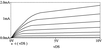Where now ffp is typically -0.3 V. Note that for pMOSFETs the body, or substrate, must never be biased more negative than the source, that is, we must always have VBS³ 0. MOSFET circuits are readily simulated using PSpice. To this end, we must first create a MOSFET model which, for the case of an n-channel device called our_nMOSFET takes on the form .model our_nMOSFET nmos (kp=kval Vto=Vval lambda=lval gamma=gval) wherekval, Vval, lval, and gval are, respectively, the measured values of k, Vtn0, ln, and gn. Then, to invoke a transistor MXXX, we use a statement of the type MXXX D G S B our_nMOSFET W=Wval L=Lval where D, G, S,and B are the drain, gate, source, and body terminals, in that specific order, and Wval and Lval are the values of Wn and L n. The following PSpice code uses the circuit of Fig. 1 to display the iD-vDS characteristics of an enhancement nMOSFET called M1 and having Wn= Ln = 10 mm, k = 200 mA/V2, Vtn0 = 1.5V, and ln = 0.05 V-1: