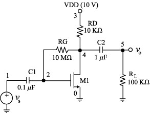 MOSFET Characteristics The characteristics are shown in Fig. 2. The following PSpice code is used to simulate the basic CS amplifier of Fig. 3 using the same MOSFET model of above: CS Amplifier After running PSpice, we obtain an output file with the following information: BIAS SOLUTION: NODE VOLTAGE NODE VOLTAGE NODE VOLTAGE NODE VOLTAGE NODE VOLTAGE AC ANALYSIS: FREQ VM(1) VP(1) VM(5) VP(5)