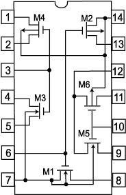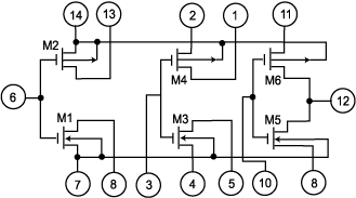 The CD4007UB MOSFET Array: We shall perform our measurements and experiments using the CD4007UB MOSFET Array. This array consists of three nMOSFETs and three pMOSFETs, all of the enhancement type, with the interconnections shown in Fig. 4. Note that the body of the nMOSFETs (pin 7), which is p-type, must always be connected to the most negative voltage (MNV) in the circuit; likewise, the body of the pMOSFETs (pin 14), which is n-type, must always be connected to the most positive voltage (MPV) in the circuit. Failure to respect these constraints may invalidate all measurements taken.