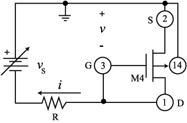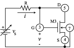 Pinchoff-Region Characteristics: We shall use the circuits of Figs. 5 and 6 to find Vt and k, the circuits of Figs. 7 and 8 to find l, and the circuits of Figs.9 and 10 to find g. In the circuits of Figs. 5 and 6 vS is a variable DC source which is used along with R to establish prescribed values of i. To perform your i and v measurements, first configure your digital multimeter (DMM) as an ammeter in series between the resistance R and the drain D to set i, then as a voltmeter in parallel with the MOSFET to measure v. In case your ammeter has been put it out of service by abuse, you can still use your DMM to perform current measurements as follows: Before inserting R in the circuit, measure it with the ohmeter; then insert R, and while monitoring with the voltmeter the voltage vR across R, adjust vS for the desired value of i (for instance, to obtain i = 100 mA with R = 98 kW, adjust vS until vR = Rx i = 98 x 0.100 = 9.8 V).